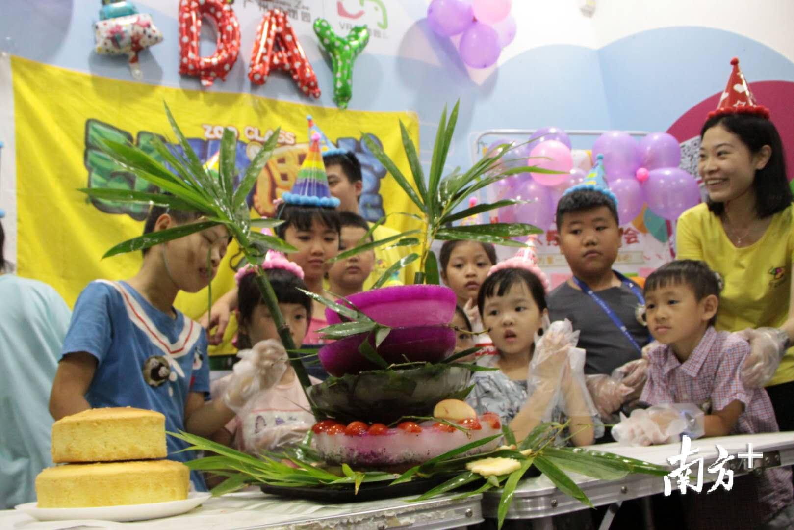 熊猫奶爸、奶妈用胡萝卜、火龙果、橙子等新鲜的水果榨汁制作了生日蛋糕,然后再用一层紫色的火龙果冰、一层橙色的胡萝卜冰、一层绿色的竹叶冰制成了漂亮的“5字”水果冰,代替生日蜡烛。现场市民齐唱生日祝福歌,“星一”和“雅一”在歌声和祝福声中优雅地享用生日蛋糕。