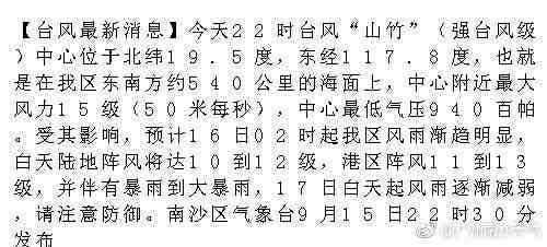 15日23时,今年第22号台风“山竹”(强台风级)中心位于广州东南方向约520公里的南海东北部海面上(北纬19.5度,东经117.6度),中心附近最大风力15级(50米/秒,相当于180公里/小时),中心最低气压940百帕。