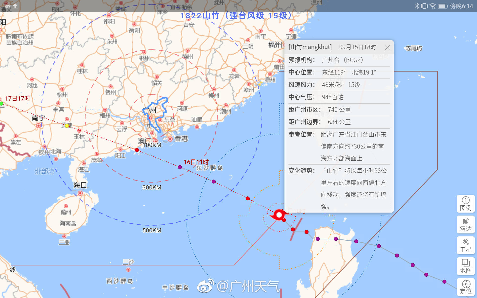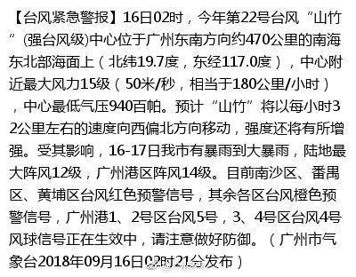 【台风防御提醒信息】广州市三防办、气象局、应急办提醒您:14日14时,超强台风“山竹”中心位于距离菲律宾马尼拉偏东方向约530公里的西北太平洋洋面上,预计其将以25公里左右的时速向西偏北方向移动,15日中午前后移入南海东北部海面,以后趋向我省西部和海南东部海面,并将于16日夜间在上述沿海地区登陆,其中16日17时前后距离南沙最近(230公里左右)。受其影响,16-17日我市将有大到暴雨,局部大暴雨,陆地阵风可达7-11级,港区达9-12级。请广大市民群众迅速做好各项防御准备。广州预警发布中心2018年9月14日17时30分发布