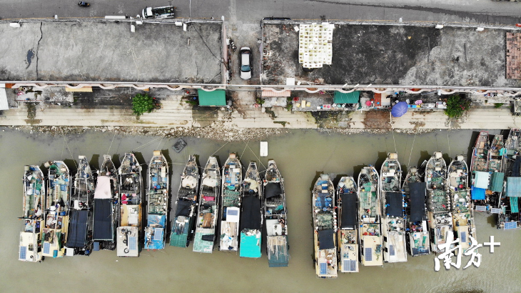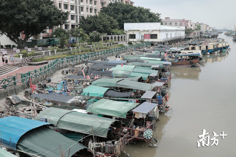 日前,在南沙区十四涌上,许多只渔船整齐地排列在河面上,在河涌上归港避风。