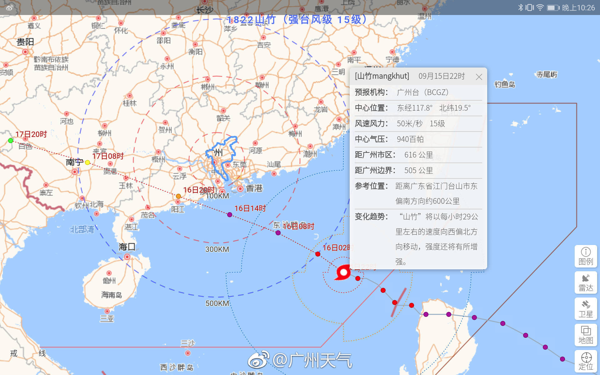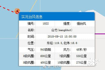【台风动态】 #台风山竹# 过去一小时,“山竹”继续向西北方向移动,22时,“山竹”中心附近最大风力50m/s,距离广州边界505公里。