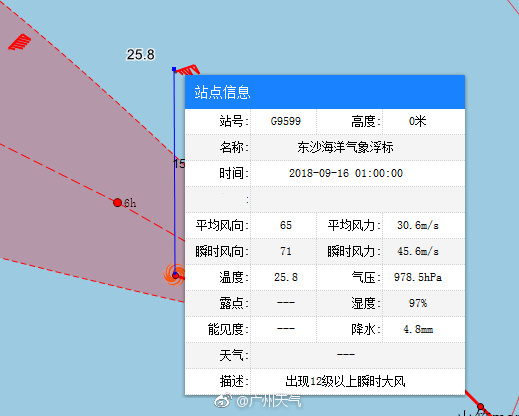 据广州气象局官方微博消息,“东沙海洋气象浮标站”在凌晨1:00在海面录得了45.6m/s(14级)的阵风,它离“山竹”中心的距离大约为155km 。