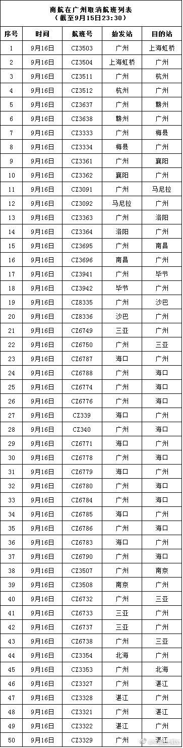受第22号超强台风“山竹”影响,截至23:30南航取消9月16日在广州进出港的50个航班。