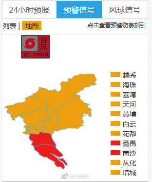 目前南沙区、番禺区、黄埔区台风红色预警信号,求各区台风橙色预警信号,广州港1、2号区台风5号,3、4号区台风4号风球信号正在生效中,请注意做好防御。