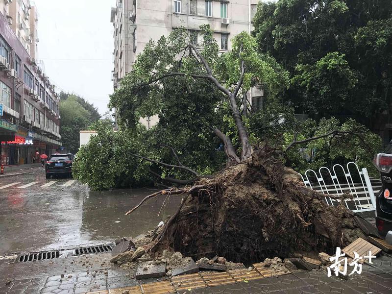 记者接爆料电话后在广州市海珠区赤岗路看到,一株高约八米的粗壮大树被连根拔起,倒在路中央。致使赤岗路交通中断,车辆纷纷掉头。