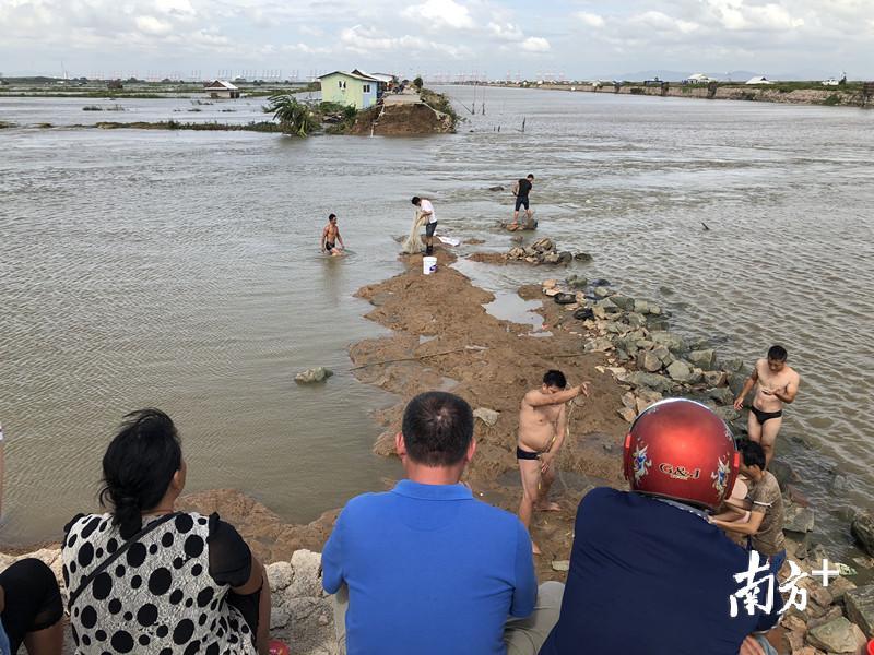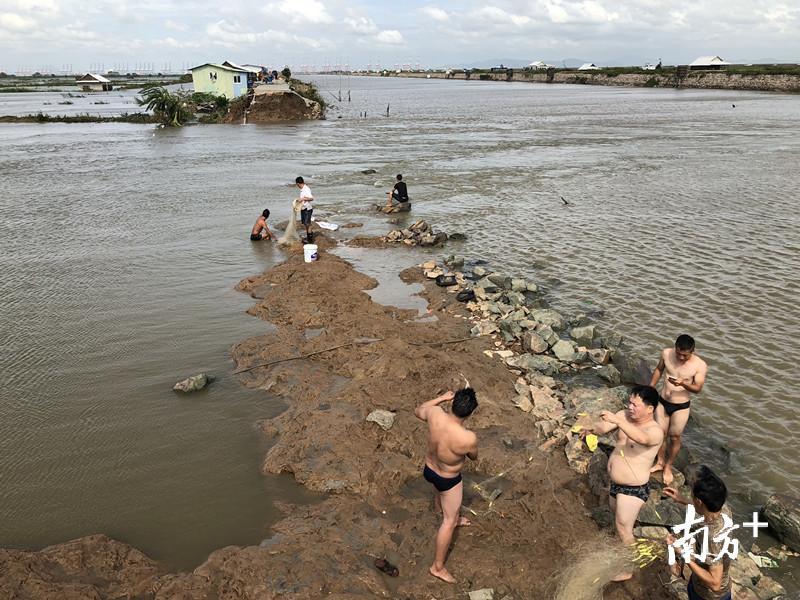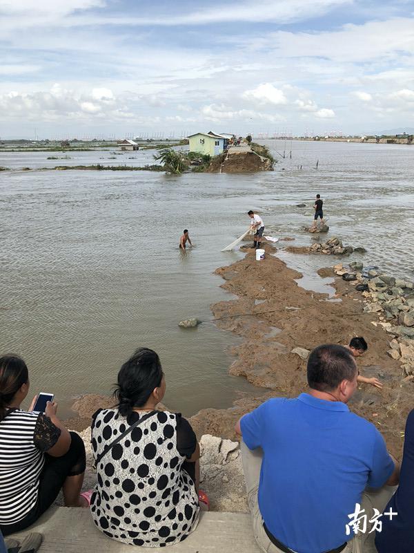 二十西围段有5500多亩鱼塘,渔民养殖了大量鱼、虾、蟹。17日一大早,渔民们赶往决堤口处看到,鱼塘已一片汪洋,部分鱼塘边的棚子被浸。“昨晚水深1米多高,我们集体宿舍都被冲垮了。”渔民许女士说。