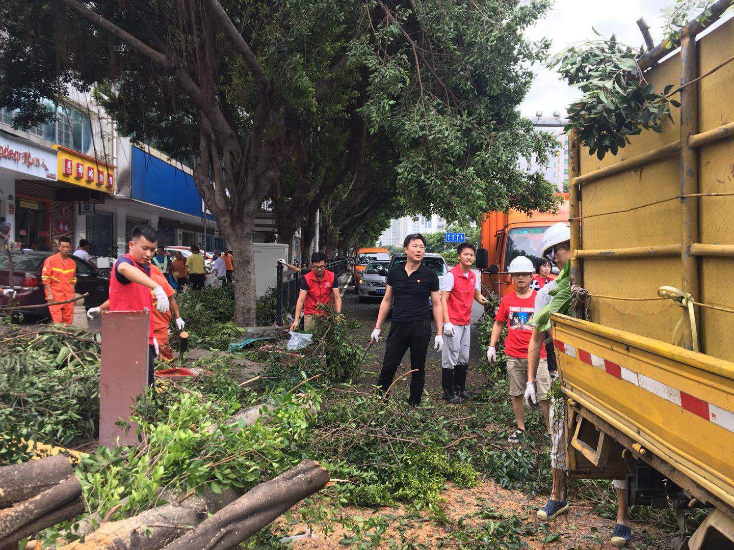 17日全天,海珠区住建水务局局长陈伟锋带领局领导及全局男同志全体出动,对辖区内进行台风后绿化、排水系统等抢险。