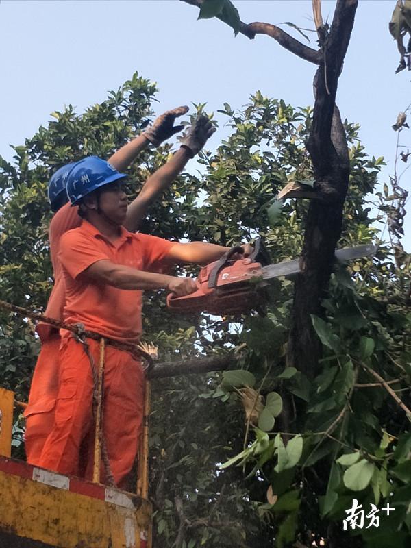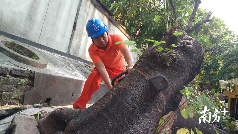 广州市绿化抢险队支部书记潘款星和队员们来到现场发现,倒伏的树木压着了电箱无法供电,现场一片漆黑。黑暗之中如何作业?无奈之下抢险团队利用车灯照明,共花了三个多小时才将五棵倒伏树木处理完毕。“团队所有队员都能够坚守自己的岗位,我们作业到17日凌晨五点才稍作休息。”潘款星说。