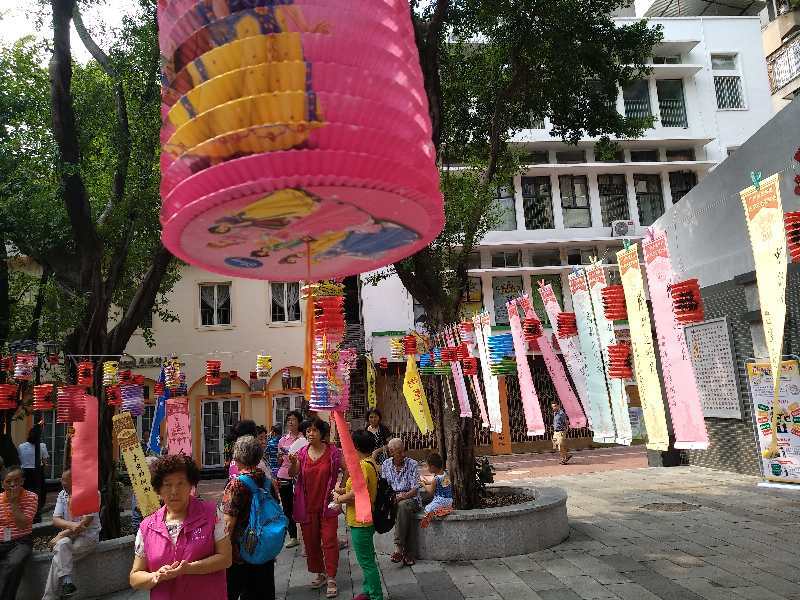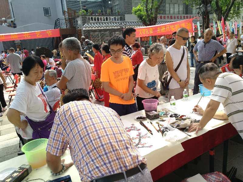 21日上午,六榕街兴隆东社区文化广场,临时搭建的舞台上正轮番上演各种文艺表演。广场两边,插花比赛、书画挥毫、中秋灯谜等活动热闹开展着。男女老少齐参与,街坊邻居笑哈哈,好一幅热闹的生活场景。