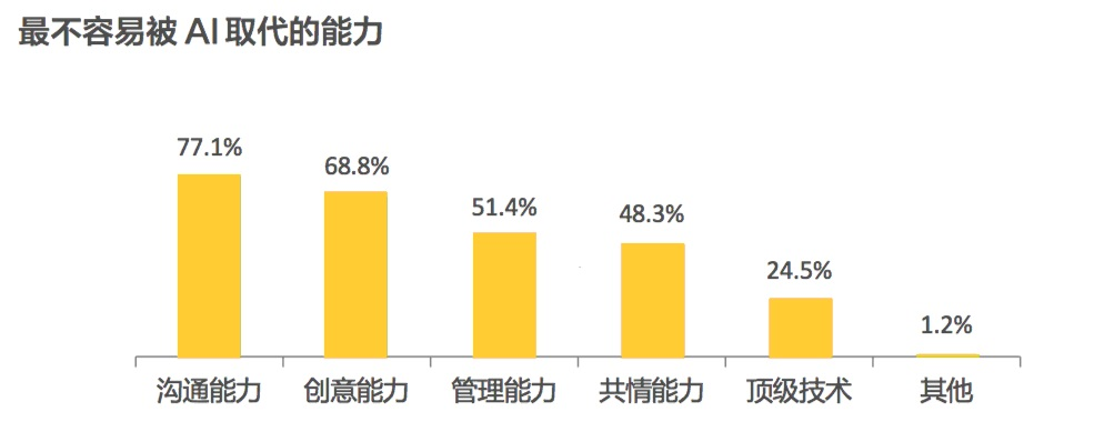 调研数据显示,77.1%的员工认为“沟通能力”最不容易被AI替代,“创意能力”紧随其后,占比68.8%。人工智能具备深度学习能力,当那些已经被归纳出算法的工作内容被编写成指令时,便意味着这个岗位可以被智能技术取代,但主动思考和共情能力却是他们难以实现的人类独有特质,“沟通能力”和“创意能力”因为是人脑中的思维和知识,无法被一套固定的指令所描写和捕捉,所以是被职场人珍视的未来竞争力。