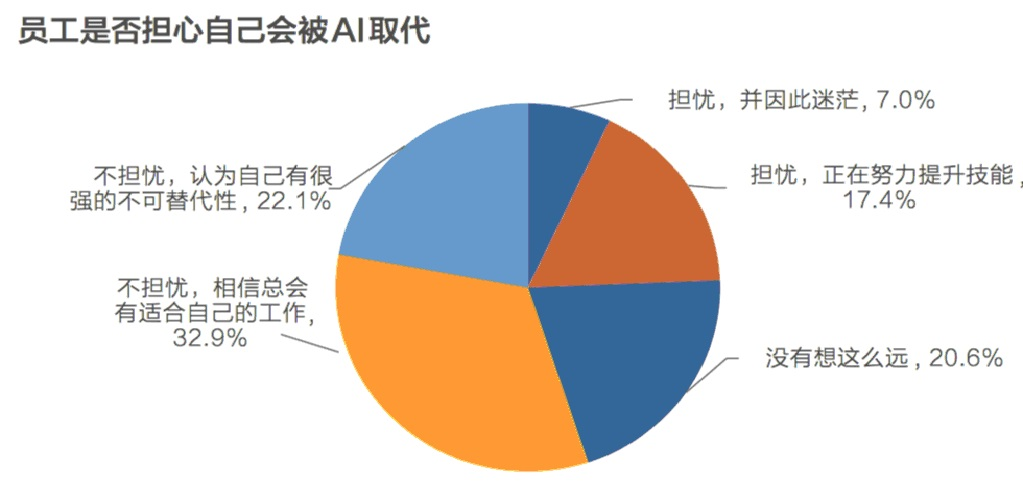 调研数据显示,55%的员工认为自己不会被AI取代,面对人工智能的威胁心态淡定。在不同的年龄层中,60后和70后最自信,认为自己不会被取代的占比高达73.7%和65.6%。70后和60后因为有了足够的工作经验,也有一定的社会地位和财富,他们会更有底气相信自己不会被AI取代,但是年轻员工不论在阅历、人脉还是技术上都缺乏优势,所以会对自己的未来更加担忧。