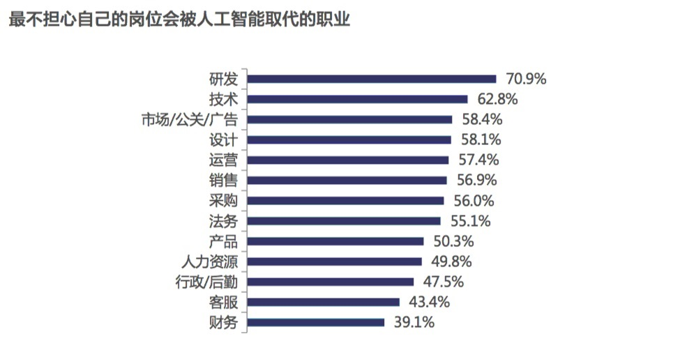 调研数据显示,“研发”岗位的员工认为自己被AI替代的可能性最低,占比70.9%,而财务人员则最担心被替代。研发岗位可以称之为人工智能的“驯机师”,他们创造着智能技术,对它的了解也更深刻。而财务岗位的工作属于典型的程式化、重复性内容,需要发挥创意和决策能力的机会不多,因此他们的担忧也不无道理。