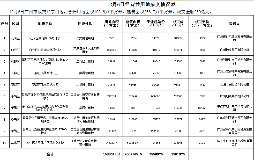 除了花都区凤凰路地块四和番禺区易兴工业园原安美防火塑料制品有限公司地块之外,本次出让的其他8宗土地均以底价成交。