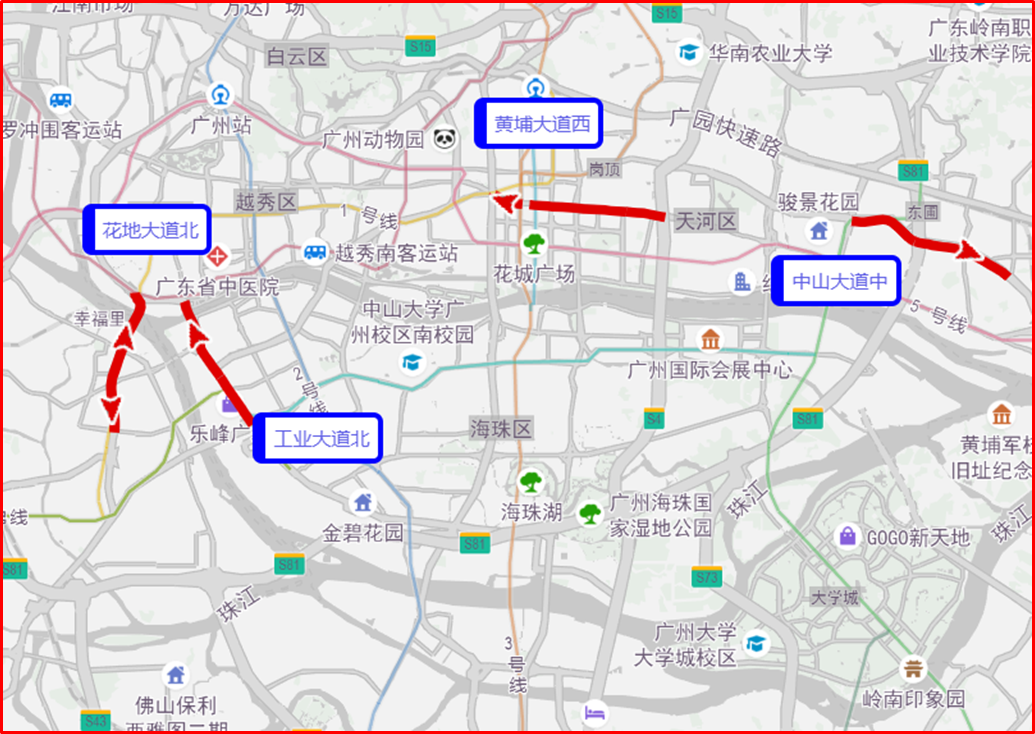 广州交警预测,节日期间,市区易发生拥堵缓行的路段有工业大道北、花地大道北、黄埔大道西、中山大道中等。