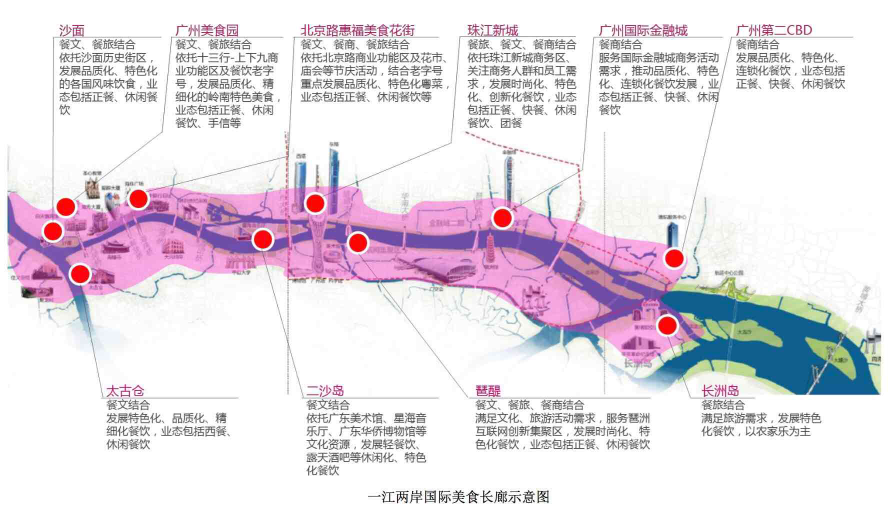 《规划》提到,广州现状餐饮发展平台主要沿珠江一江两岸布局,适宜延伸并融合文化、旅游等要素,呈带状发展。通过空间整合、景观整治、交通组织、业态优化等措施, 打造一江两岸国际美食长廊。