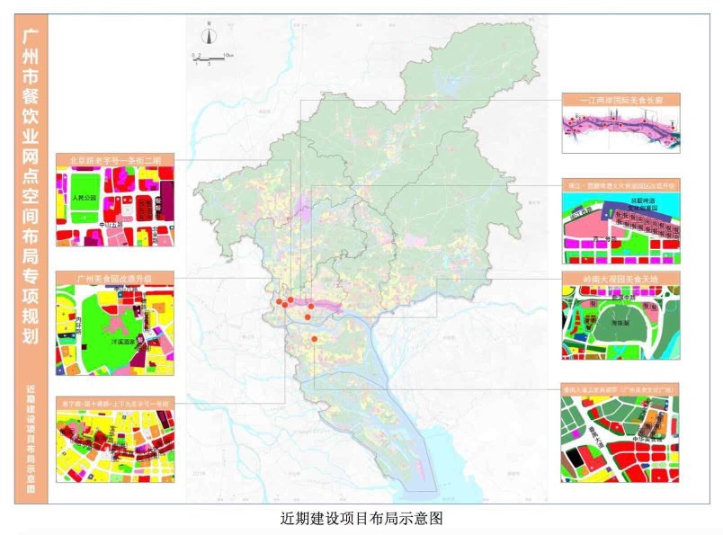 具体而言,广州将衔接落实《广州市商务发展第十三个五年规划(2016—2020年)》(2016), 策划近期7个重点建设项目,包括:一江两岸国际美食长廊、珠江·琶醍啤酒文化创意园区改造升级、北京路老字号一条街二期、番禺大道五星商旅带(广州美食文化广场)、广州美食园改造升级、恩宁路—第十甫路—上下九老字号一条街、岭南大观园美食天地。