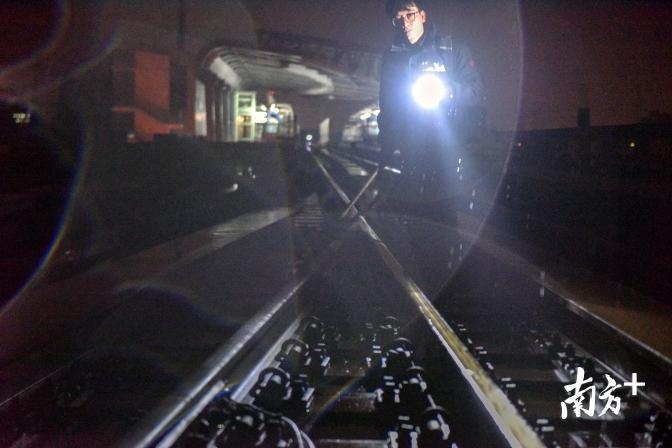 晚上10:00,由于正值春节假期,蕉门站只有些许乘客在站台候车。在三三两两的乘客中,迎面走来一位神采奕奕的男子,他便是广州地铁的工建检修师——朱建新。他身穿橙黄背心,背着工具包,手执冷光手电筒,在轨道线路上进行隐患设备排查处理。
