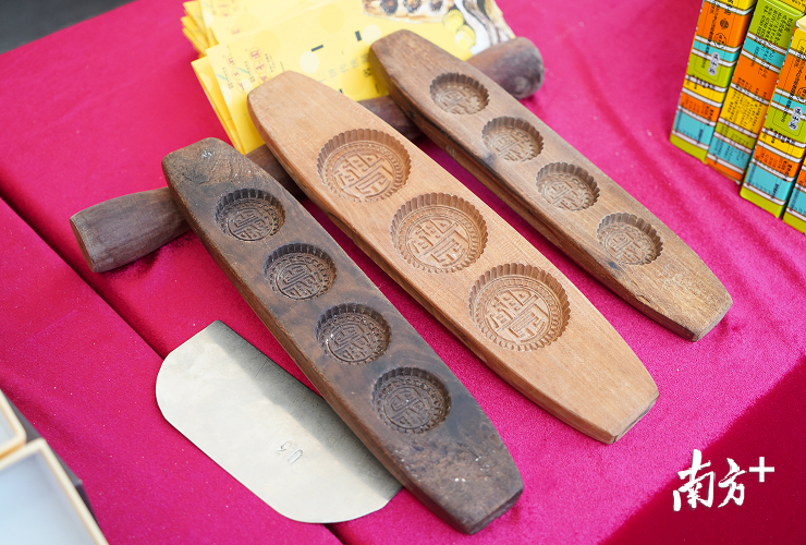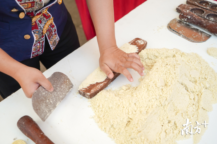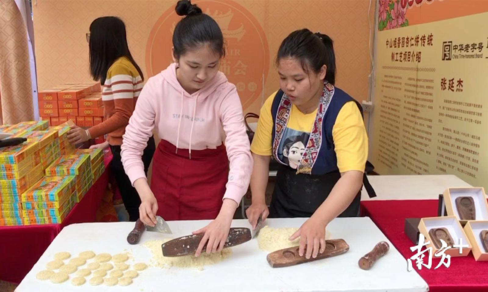 在广府庙会上,来自香港、澳门及深圳、珠海、佛山、中山、东莞、惠州、江门、肇庆的非遗项目与广州非遗同台亮相,中山咀香园杏仁饼传统制作技艺也作为大湾区的非遗项目代表,受到了市民和游客的欢迎。在现场,市民和游客不仅能品尝到香脆可口的杏仁饼,还能亲自上阵,在非遗传承人或是做饼师傅的指导下,亲自动手体验杏仁饼做法,感受流传百年的传统手工艺。