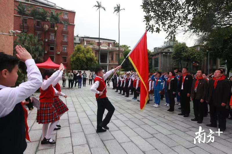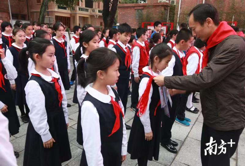 活动仪式上,成立了“新时代越秀少年红色史迹讲解队”。这支队伍以越秀区“红领巾之路”为主线,以团队衔接为切入点,团员与队员以中队、小队结对子的形式,结合学雷锋行动纪念日,走进“红领巾之路”中的中共三大会址纪念馆,开展红色史迹讲解活动。当各校讲解队分队的代表从区、局领导手中接过讲解队队旗、胸前挂上光荣的讲解员证时,自豪洋溢在他们脸上,责任更升腾在彼此的心中。