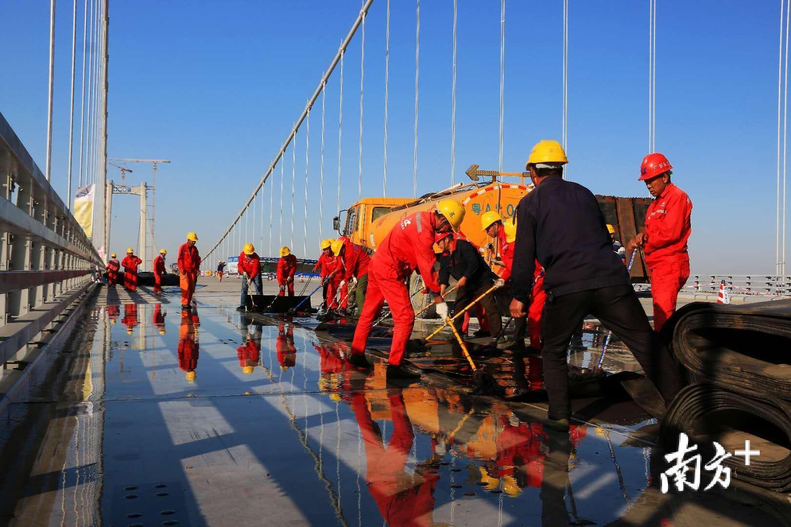 虎门二桥桥面上机器轰鸣,摊铺机、压路机等轮番上阵,身穿反光衣的大桥工人们正在紧张忙碌着。日前,虎门二桥建设项目索塔被喷上“南沙大桥”字样,这些细节都意味着这一横跨珠江口东西两岸的重大交通基础设施,进入了开通倒计时。