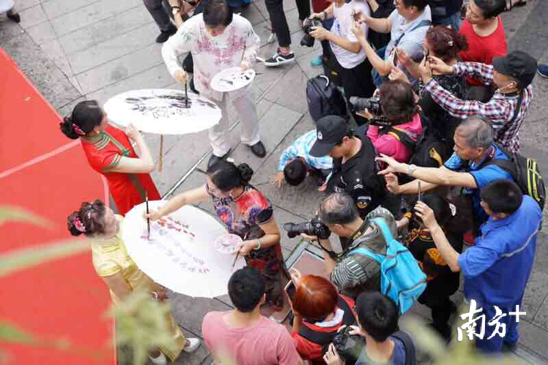 在西关,除以端庄淑雅、追求新潮的“西关小姐”闻名遐迩外,书画、粤剧等也有所成就。活动上,18名书画名家在荔园广场,以“荔枝湾﹒新西关”为主题进行书法创作,穿上特色服饰即席挥毫,展现大家风采。