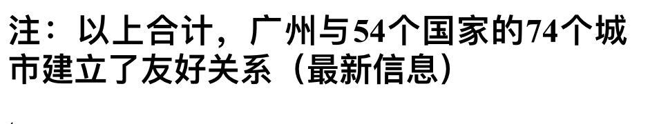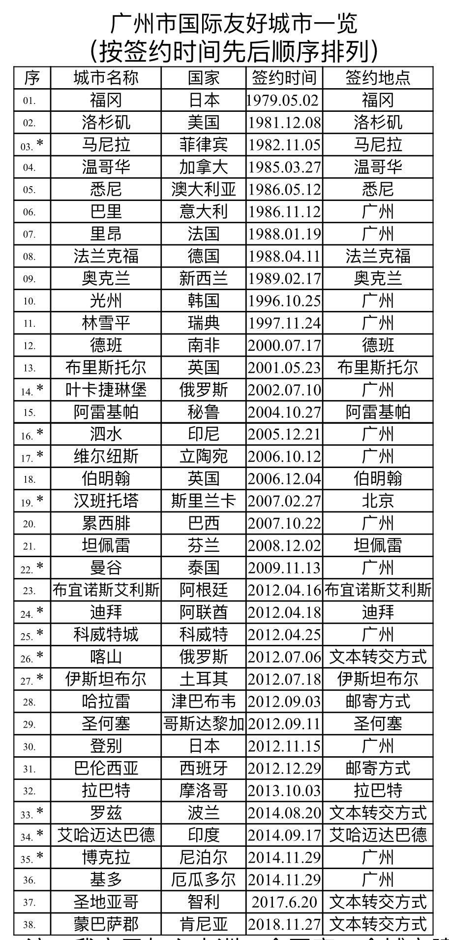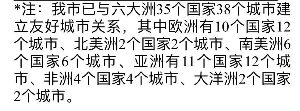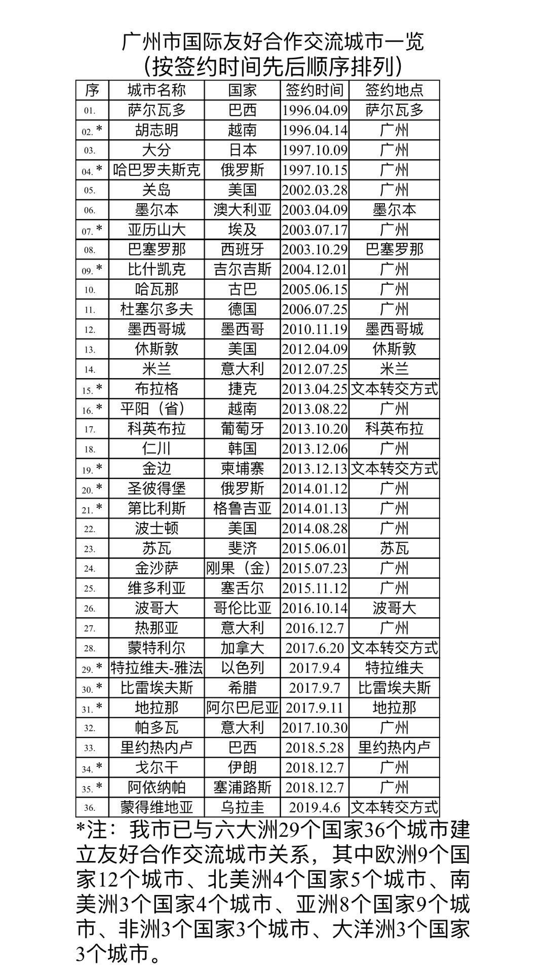 至此,广州市与六大洲29个国家36个城市建立“友好合作交流城市”关系。其中欧洲9个国家12个城市、北美洲4个国家5个城市、南美洲3个国家4个城市、亚洲8个国家9个城市、非洲3个国家3个城市、大洋洲3个国家3个城市。