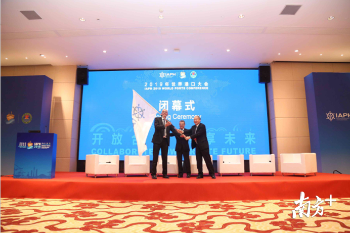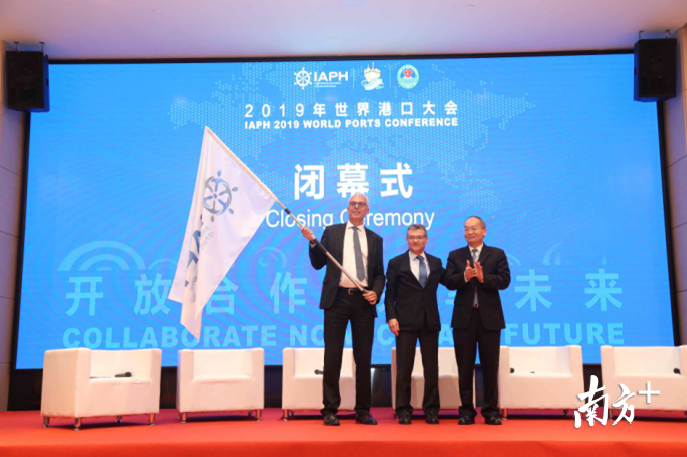 5月9日下午,广州市港务局局长陈洪先将象征着世界港口大会主办权的会旗移交到了安特卫普港代表卢克·亚诺思手中,2019年世界港口大会圆满落幕。
