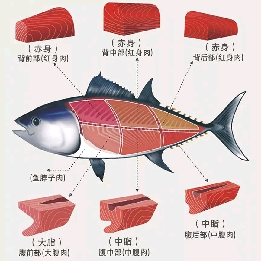 腹部前身 > 腹部中段 > 腹部尾段 > 背部赤身前段 > 背部赤身中段 > 背部赤身尾段