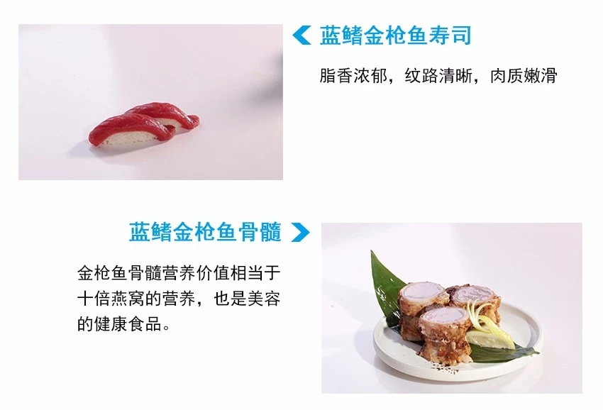 蓝鳍金枪鱼的油脂丰富,肉质鲜嫩细腻,食后回甘,是做刺身的顶级食材。其高达15%的脂肪含量,让它拥有绝佳口感,是全世界公认的顶级美味。