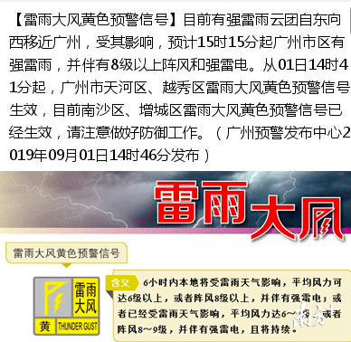 据@广州天气,目前有强雷雨云团自东向西移近广州,受其影响,预计15时15分起广州市区有强雷雨,并伴有8级以上阵风和强雷电。从9月1日14时41分起,广州市天河区、越秀区雷雨大风黄色预警信号生效,目前南沙区、增城区雷雨大风黄色预警信号已经生效。
