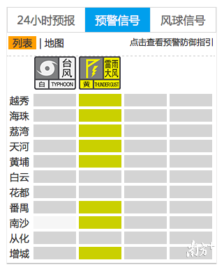 截至15:00,广州有8区发出雷雨大风黄色预警,除却白云、花都、从化外,各区均有雷雨大风。