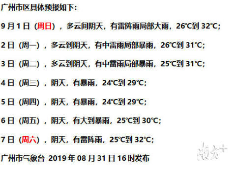 9月1日,多云间阴天,有雷阵雨局部大雨,26~32℃;