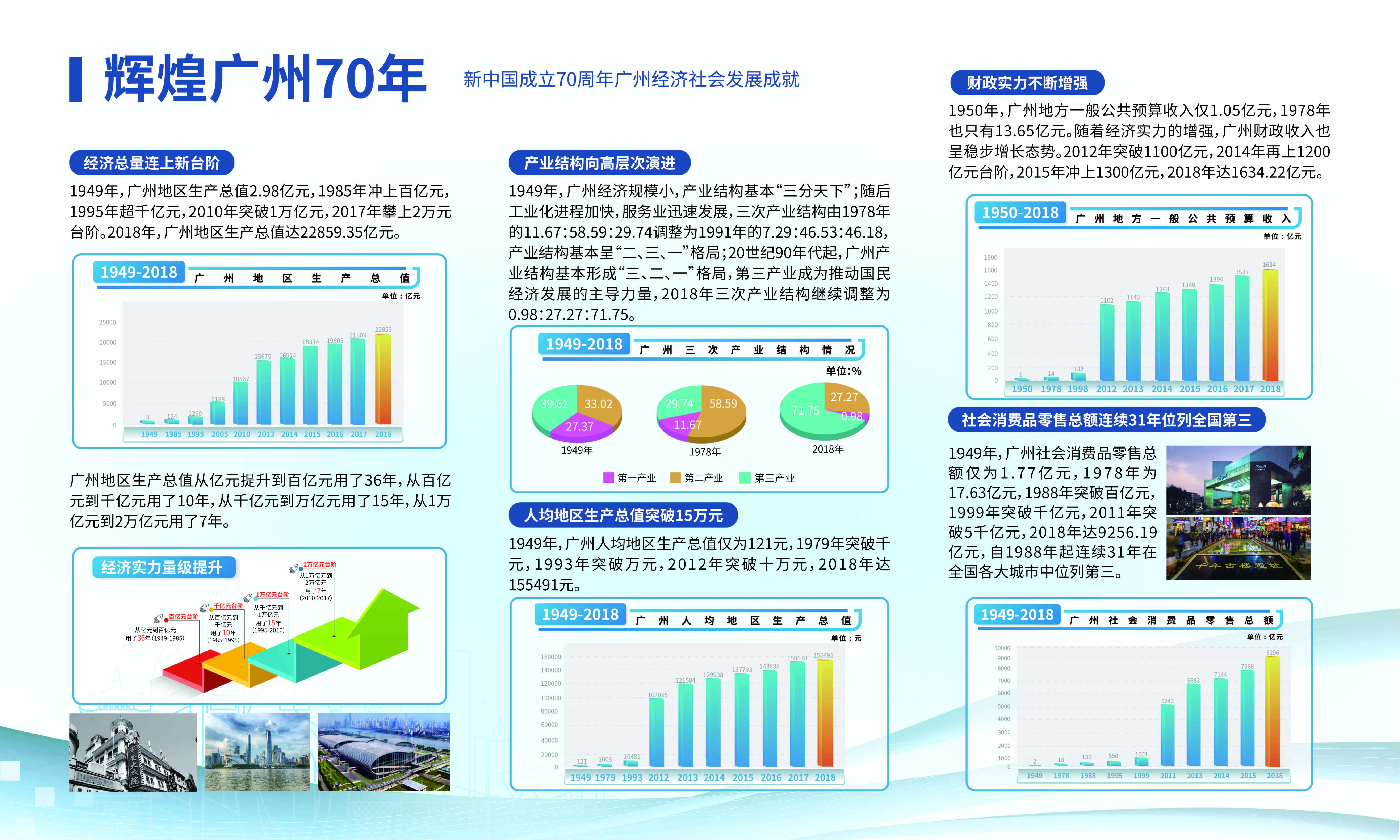9月10日,广州市统计局发布数据显示,新中国成立70年来,经济总量连上新台阶,财政实力不断增强,人均地区生产总值达到高收入国家或地区水平,综合实力明显提升。