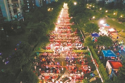 记者在现场看到,不到4点,小区广场空地上已经摆满了几百张圆桌,颇为壮观。现场也经过精心布置,留影墙、头顶彩灯一个都不少。6点左右,在初秋晚霞中,业主端着美味佳肴陆续到场。