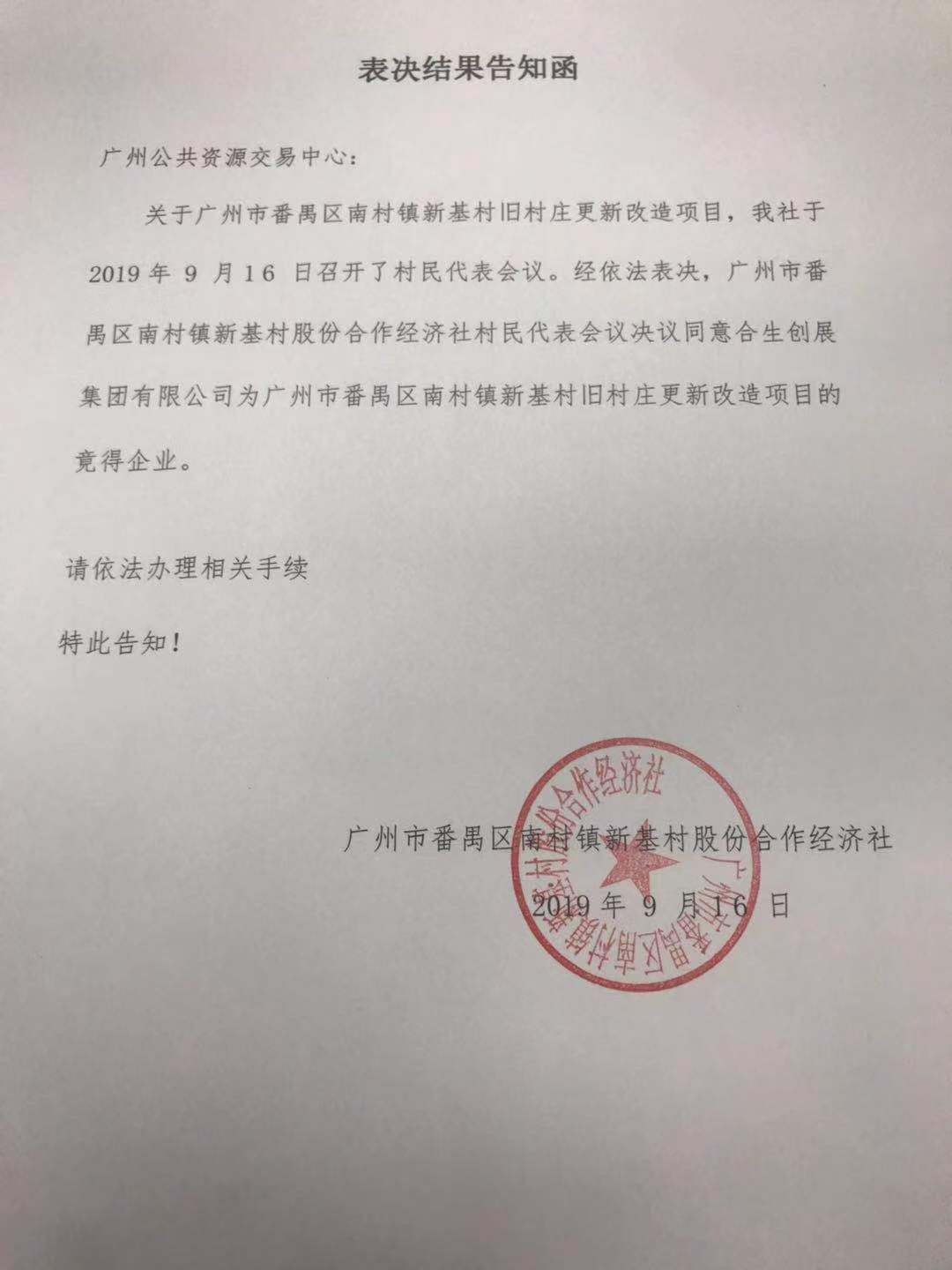 9月17日,番禺区南村镇新基村旧村改造项目竞选结果公示在广州公共资源交易中心网站挂出。公示显示,新基村旧村改造项目按规定程序进行了资格审查,并经招商主体成员代表会议表决,同意合生创展集团有限公司为本项目的竞得企业。