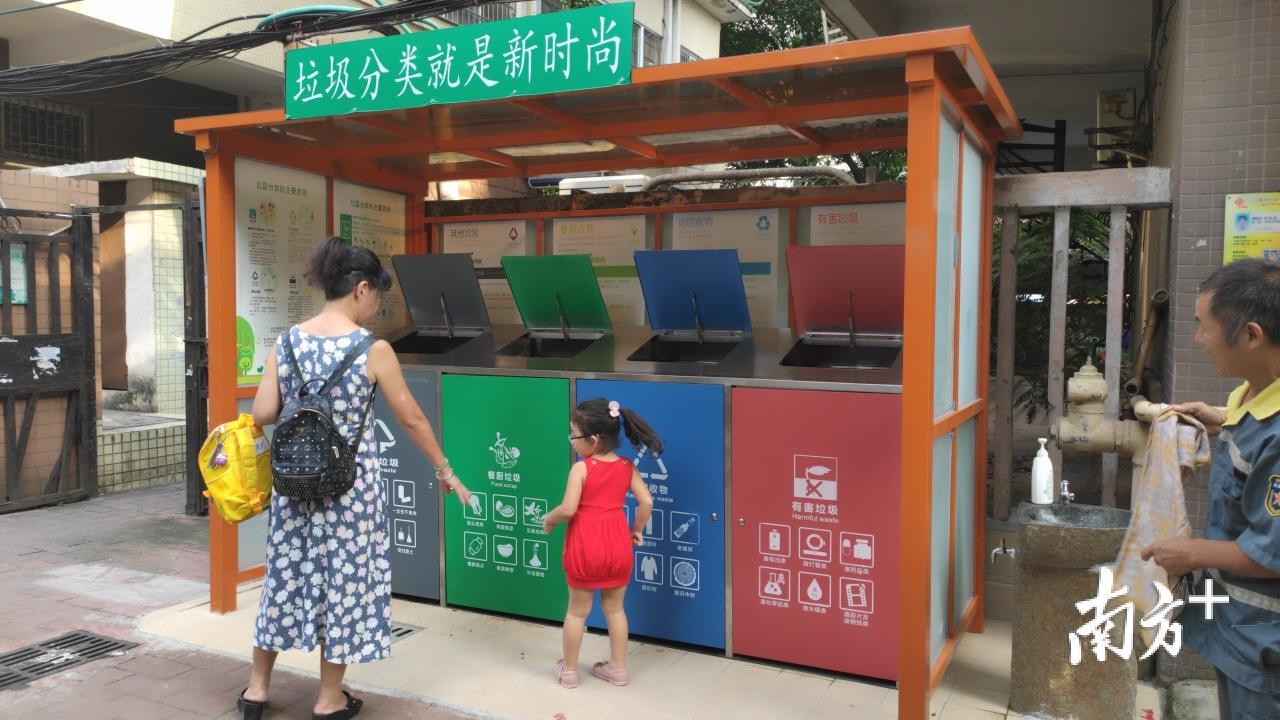 海珠区沙园街的广重北小区也是广州垃圾分类的样板小区。该小区2014年就已撤桶,但最近一个星期才开展破袋定时定点投放。19日下午4点,在小区入门处,记者看到一个垃圾分类投放点,四类垃圾箱并排设置,旁边配置了洗手液和洗手台,还有一个小亭子可以遮风挡雨。