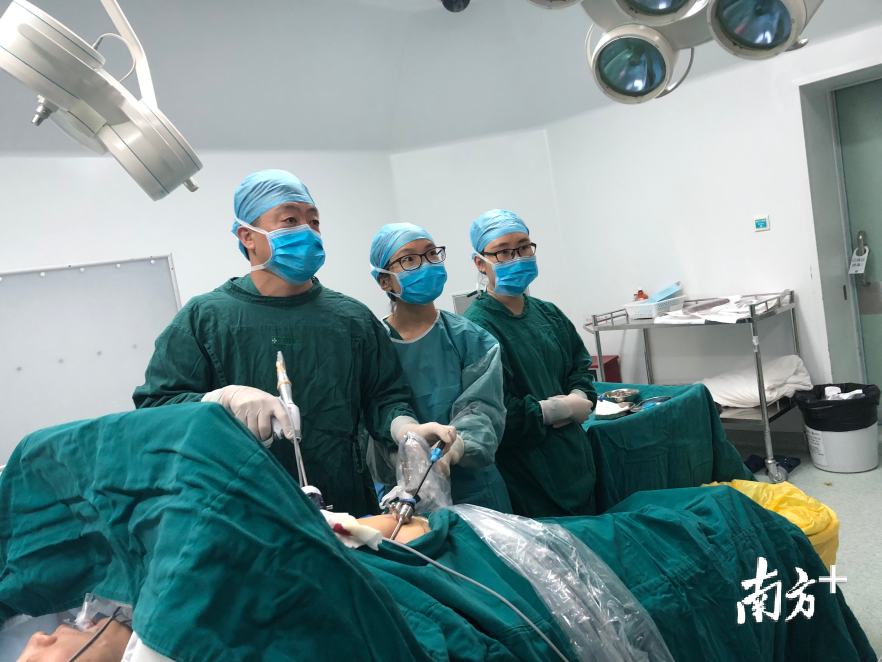 在向普通外科蒲淼水主任汇报情况后,蒲淼水指示马上进行急诊腹腔镜手术。腹腔镜手术不需开腹,仅在腹部打3个0.5厘米的小孔,把腹腔镜伸进去探查、手术。
