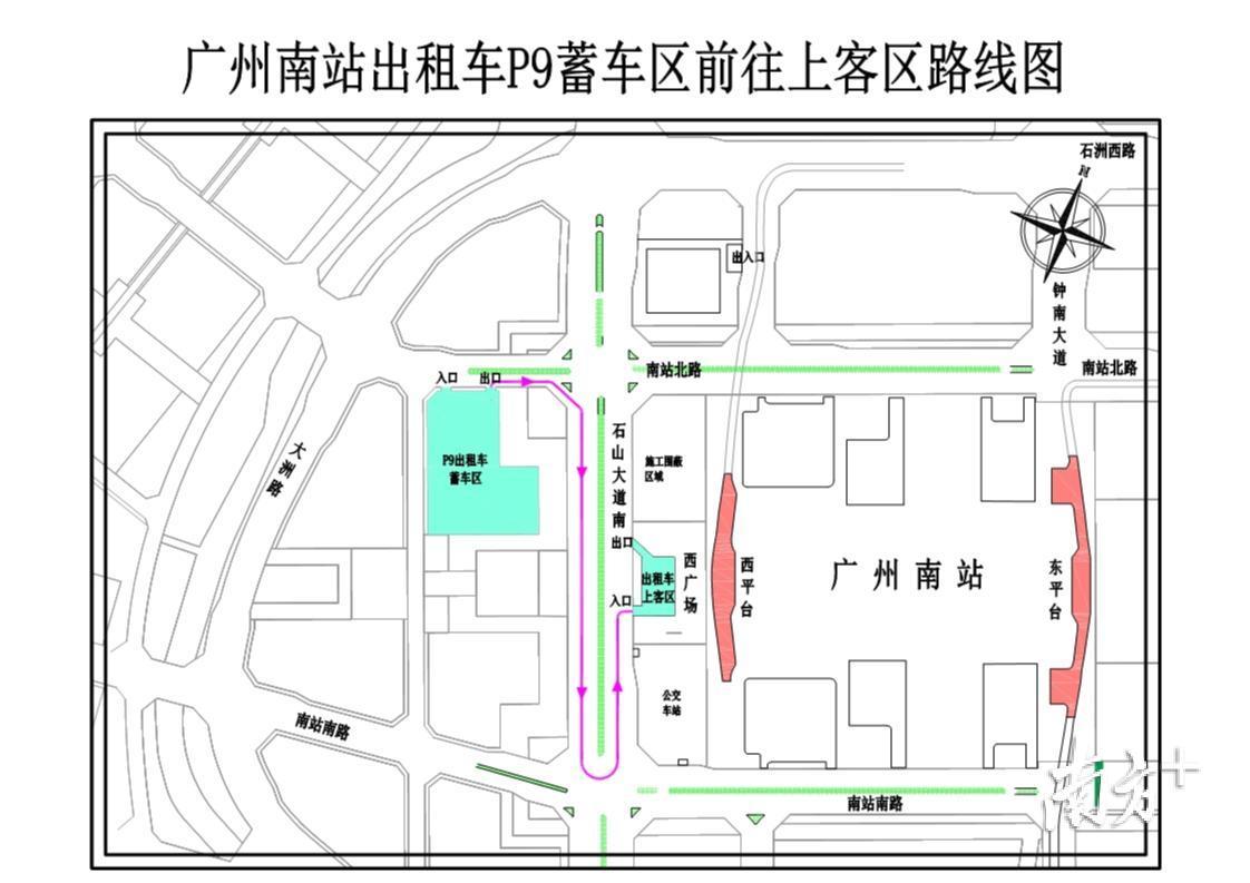 笔者今日从番禺区获悉,番禺区委区政府决定,于2019年10月18日6时开始(本周五)将广州南站出租车场蓄车区搬迁至广州南站P9停车场(南站北路与大洲路交界处东南面地块)。出租车场P9蓄车区启用后,石山大道南将恢复10车道双向通行。