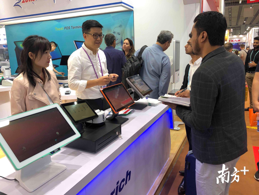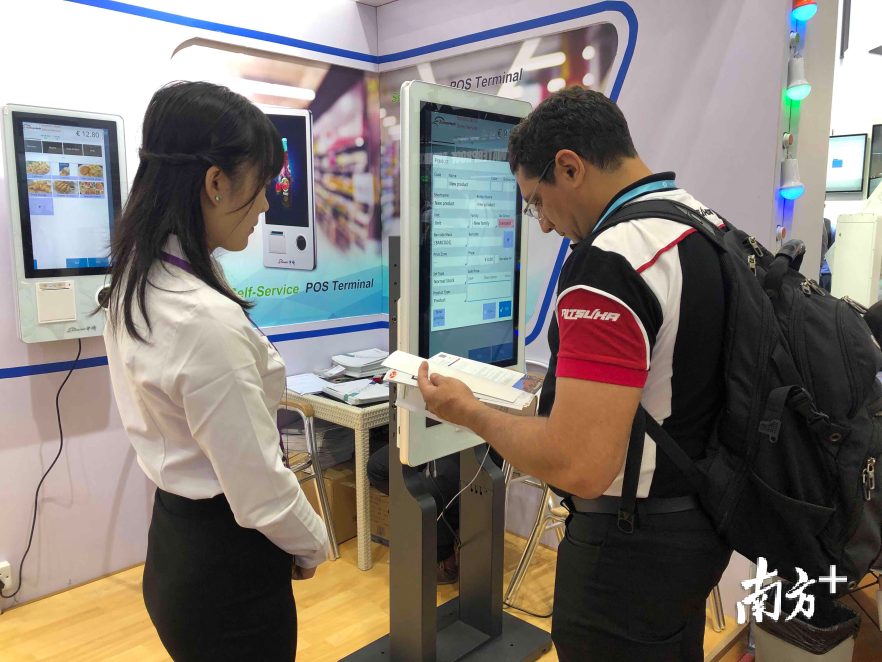 这样的自助收银终端,也出现在了本届广交会的会场。在广州市中崎商业机器股份有限公司(下称“中崎商业”)展位上,从传统的桌面收银机到新式自助收银终端依次排开。该企业展位负责人姚彩宾介绍,中崎商业已经参会近20届,是广交会的“老朋友”了。