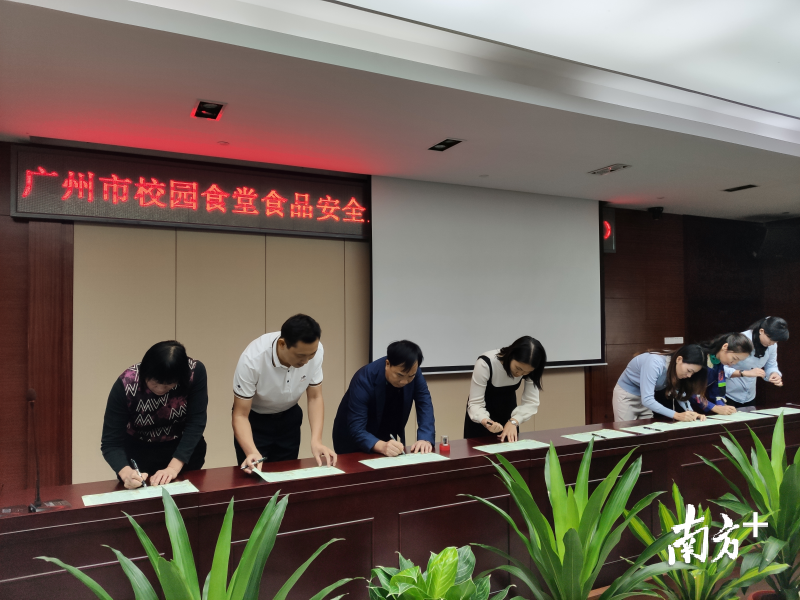 10月31日,广州市市场监督管理局会同市教育局、市人力资源和社会保障局联合开展校园食堂食品安全宣传教育活动,学校校长(园长)与食堂、餐饮承包企业代表现场签署《校园食堂食品安全承诺书》,承诺严格遵守法律法规,切实做到“八个确保、四个规范”,切实履行食品安全第一责任人职责,自觉接受并积极配合食品安全监管部门的监督管理。