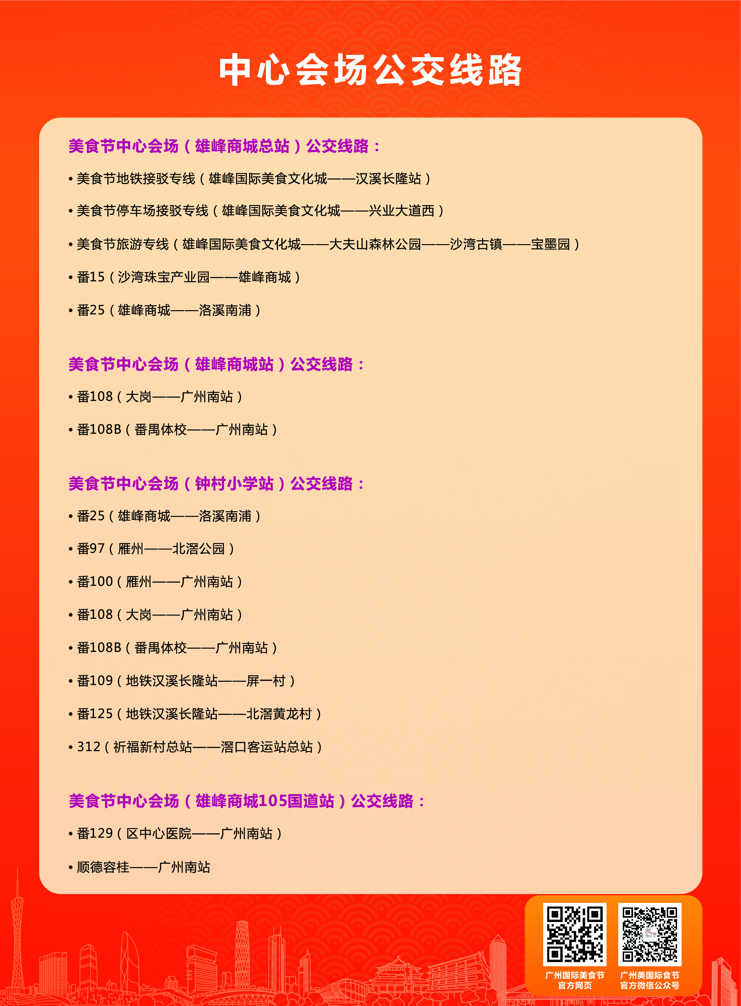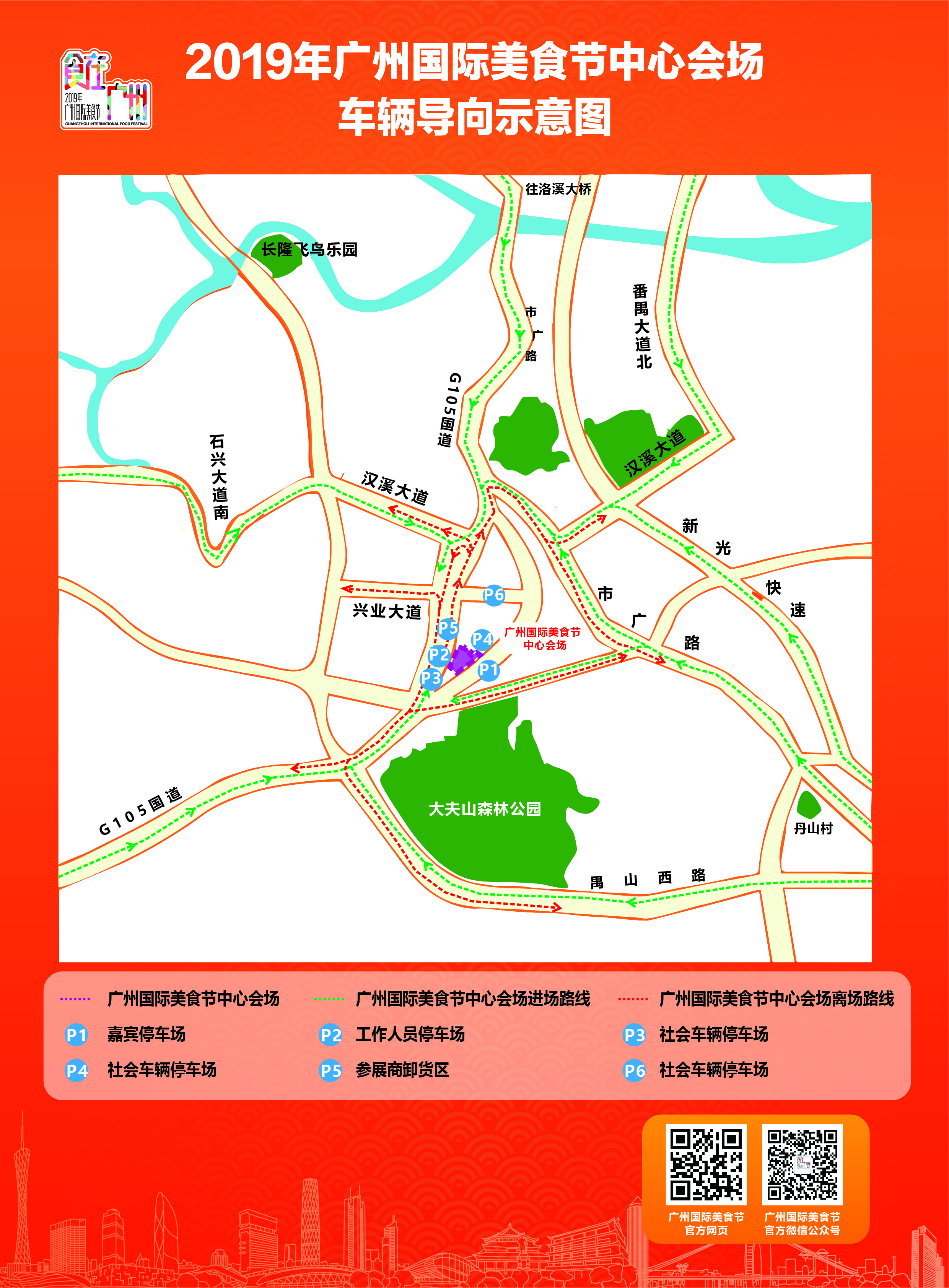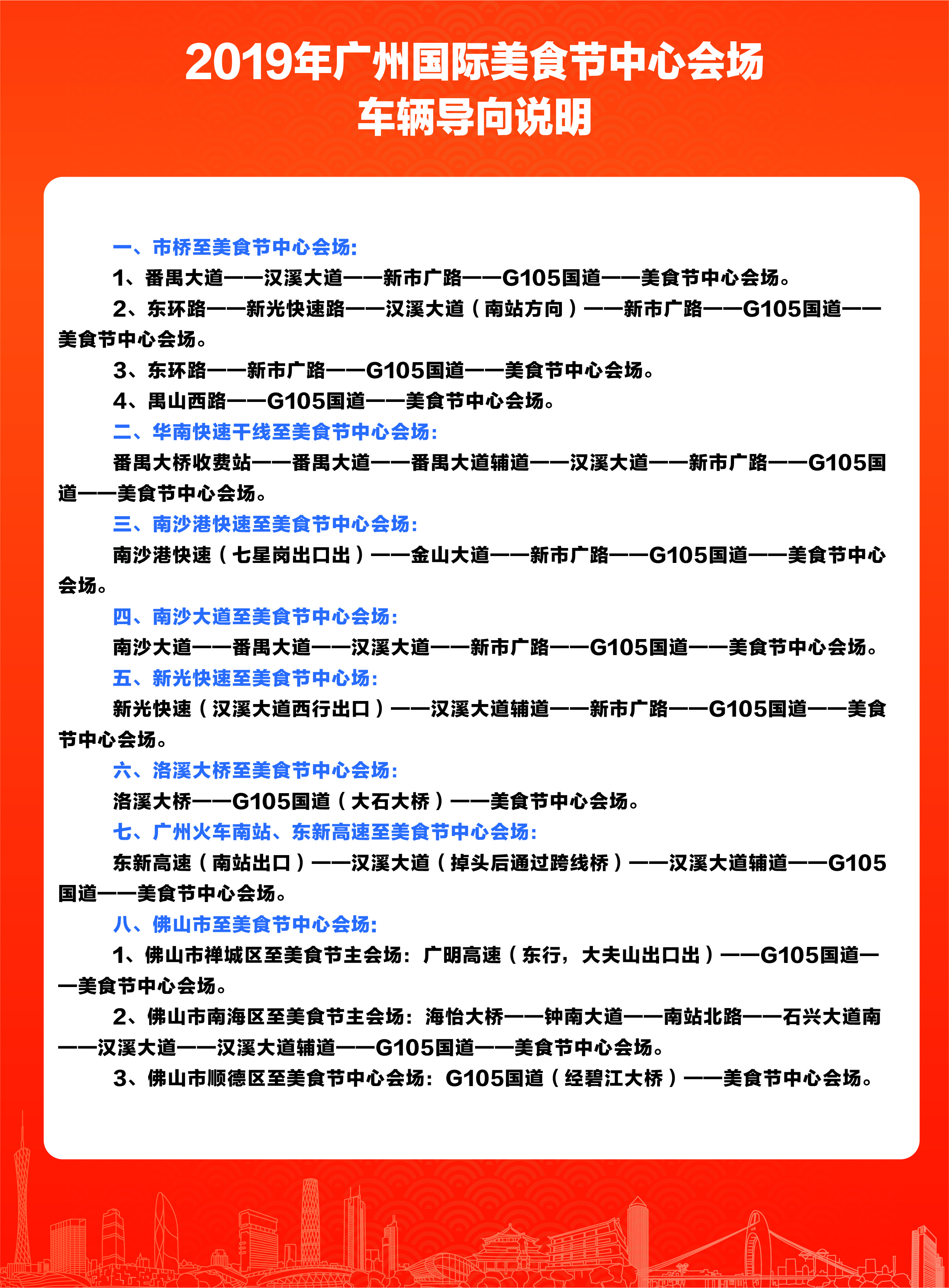 广州国际美食节组委会呼吁广大市民绿色出行,尽量乘坐公共交通工具前往美食节中心会场,请自驾车市民群众届时听从现场交警指挥。