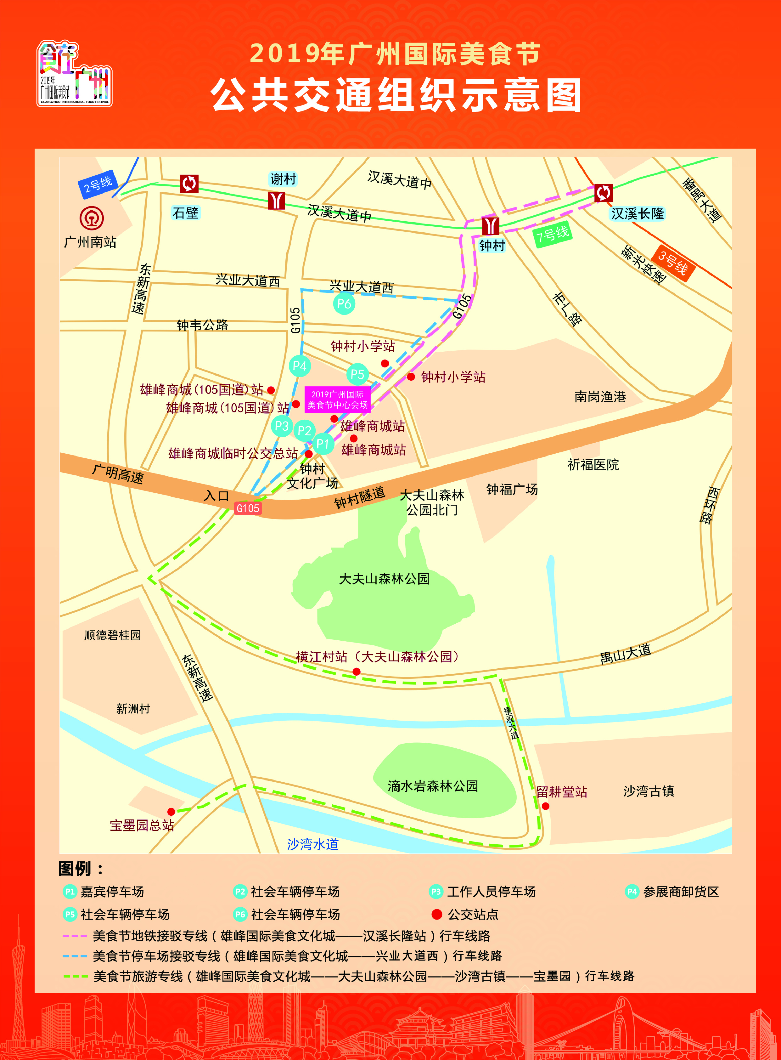 三是在美食节期间开行三条临时接驳专线。一条为停车场接驳专线(兴业大道西—主会场),一条为地铁接驳专线(汉溪长隆—钟村—主会场),一条为旅游接驳专线(宝墨园—沙湾古镇—大夫山—主会场),三条临时接驳专线计划投入14台车。