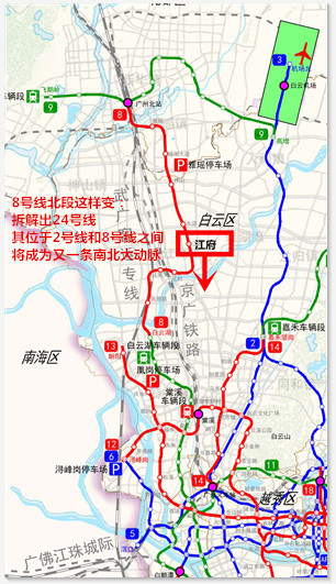 根据广州轨道交通第三期建设规划,8号线将在建设中的北延段(凤凰新村-滘心)的基础上,进一步往北延伸20公里至广州北站。最新的规划调整将8号线北延花都段“一分为二”,线路在江府站预留拆解条件,江府以南为8号线,江府至广州北站独立成为24号线,往市区方向延伸。
