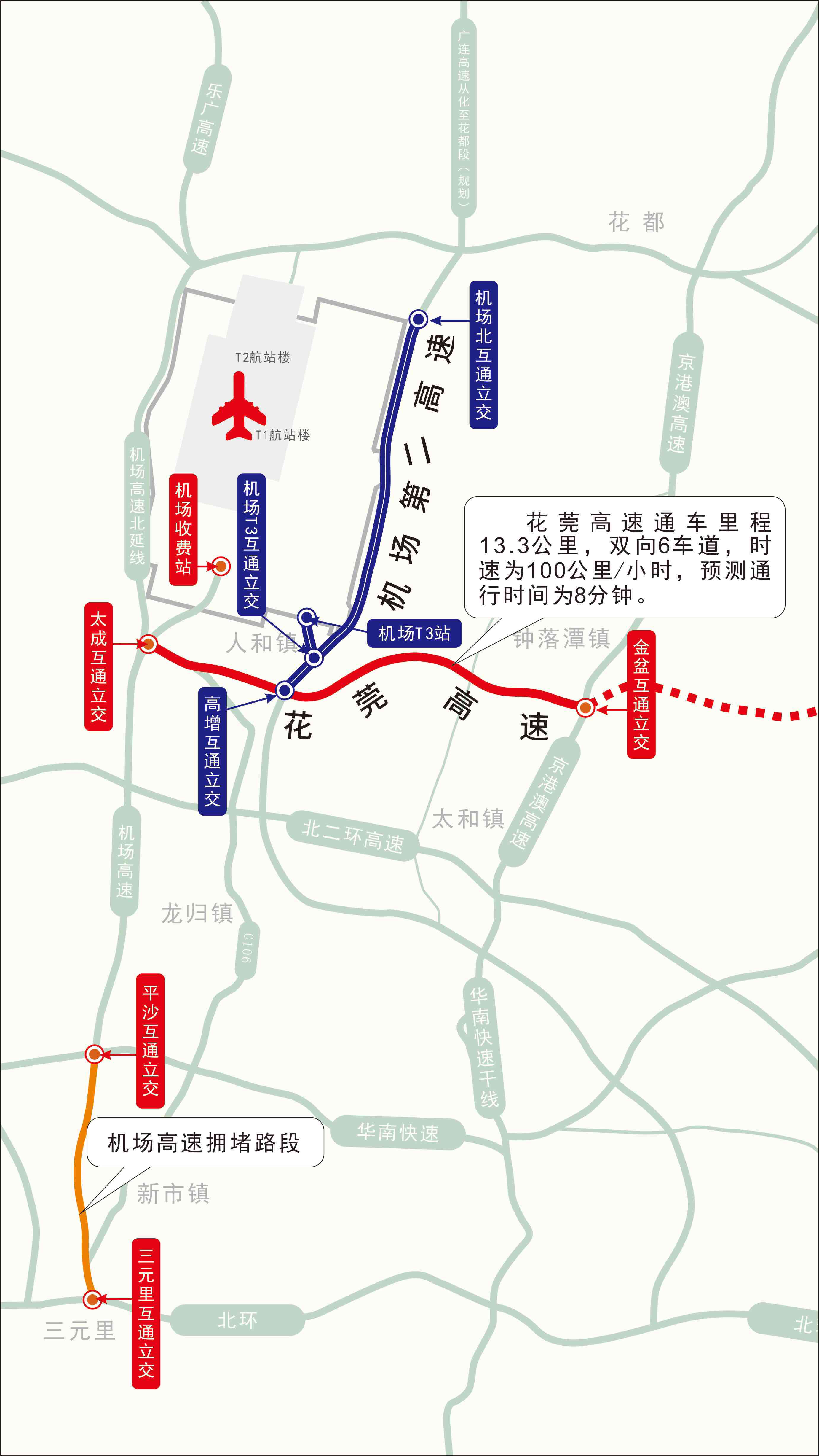 这一路段位于北二环高速与北三环高速之间,通车后,广州进出广州白云国际机场将新增一条东部便捷通道。车辆可经京港澳高速,在金盆互通立交处转入花莞高速,再从太成互通立交到达机场,可避开机场高速三元里互通立交至平沙互通立交段、北二环高速转入机场高速段的拥堵路段,极大减少路程时间。