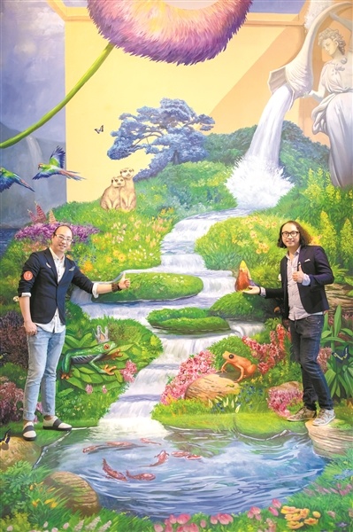 采访万氏兄弟是在他们新开的位于琶洲的“自觉”艺术馆内。馆内正中央,是万氏兄弟两人花了三个月的时间创作的一幅面积约三十平方米的3D立体画,花卉、动物、流水……鲜艳明亮的色彩显得整幅画童趣十足。定睛一看,画中还有不少闪烁的光亮。“那些是施华洛世奇元素,”万以珩之后笑着谈及:“你肯定没想到,这次我们用了上万颗钻石点缀,也算是一种突破。”