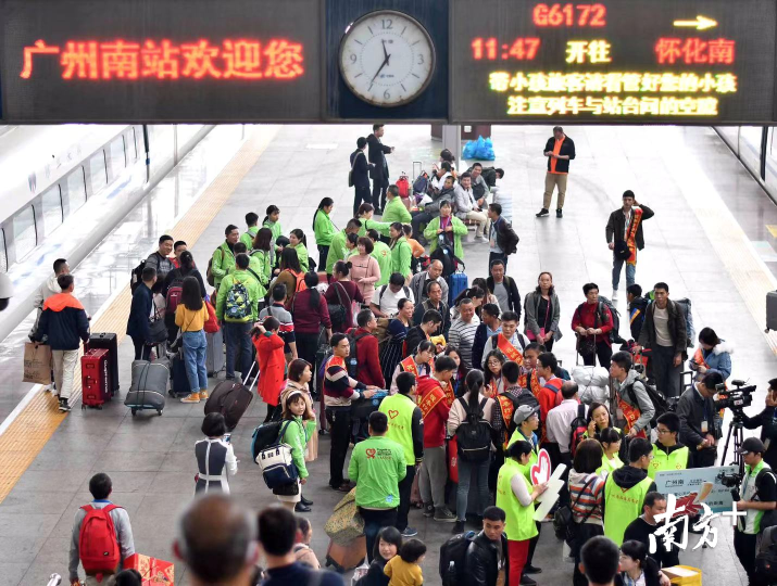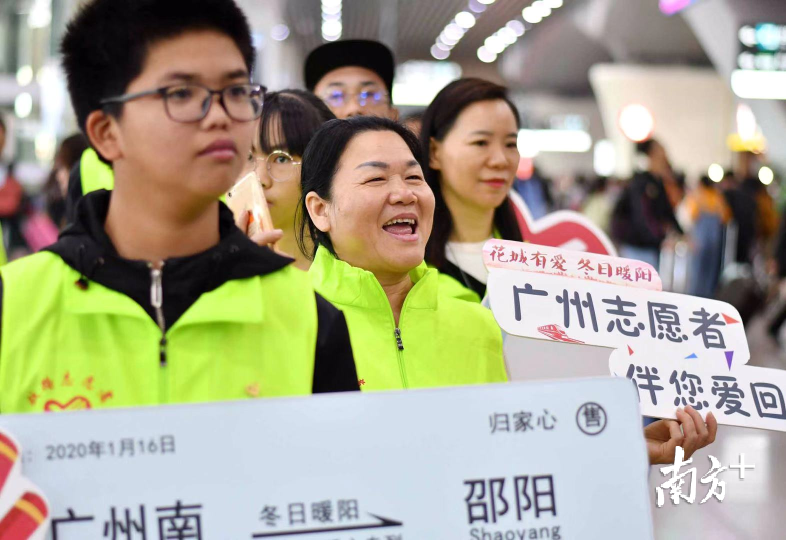 在广州南站的春运大军里,记者观察到,场外临时取票点、进站指引点、物资卸货点、地铁站出口、候车室、安检区随处可见志愿者忙碌的身影。“今年增加了一些志愿者在地铁口和安检口,还准备了横幅举行欢迎仪式。这份仪式感让刚下地铁、刚到车站的乘客就能感受到温暖。”志愿者罗炜琪说。