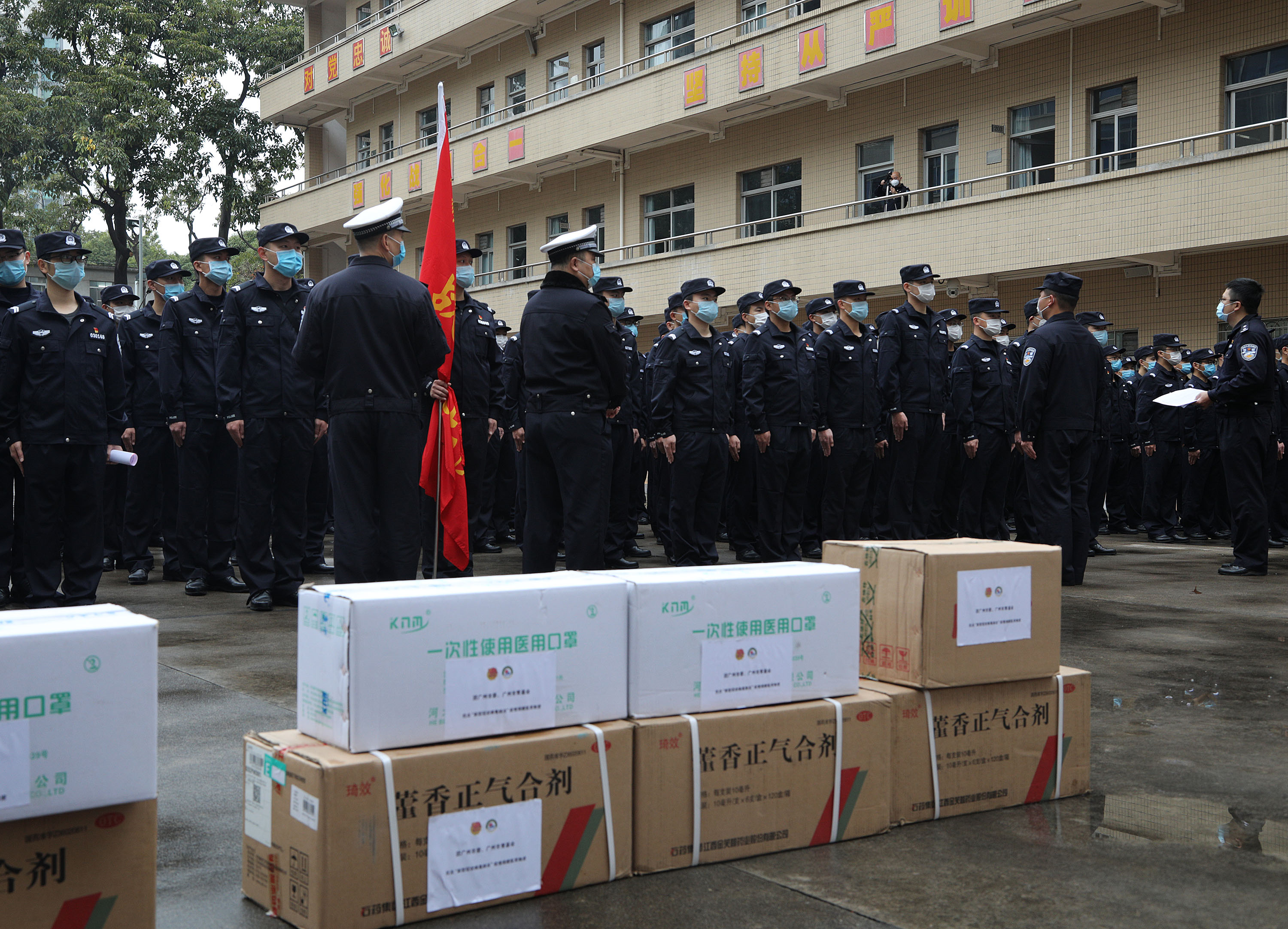当天,由团广州市委指导,广州市青少年发展基金会、市公安局团委主办的新警团员青年战“疫”突击队授旗仪式暨“众粤同心 抗击疫情”—医疗防护物资捐赠仪式上,广州市青少年发展基金会向新警团员青年战“疫”突击队捐赠2000个医用口罩、250瓶酒精消毒液、6000瓶藿香正气口服液等医疗防护物资。