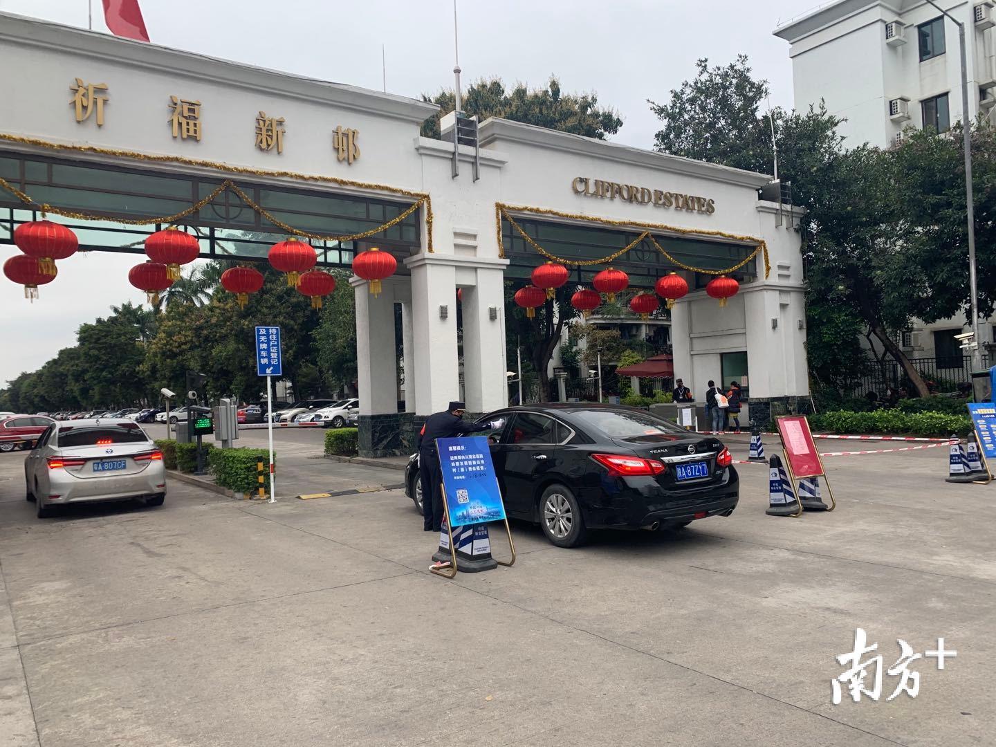 2月7日下午3:50,记者在番禺区祈福新邨入口看到,,几辆小汽车正在排队等候,保安正在对车内人员逐一进行体温检测。祈福新邨业主杨小姐告诉记者,这几天小区防疫措施再次升级,外卖、快递已经被禁止进入小区内了。“我们昨天点的外卖,都是自己到大门口拿的。”