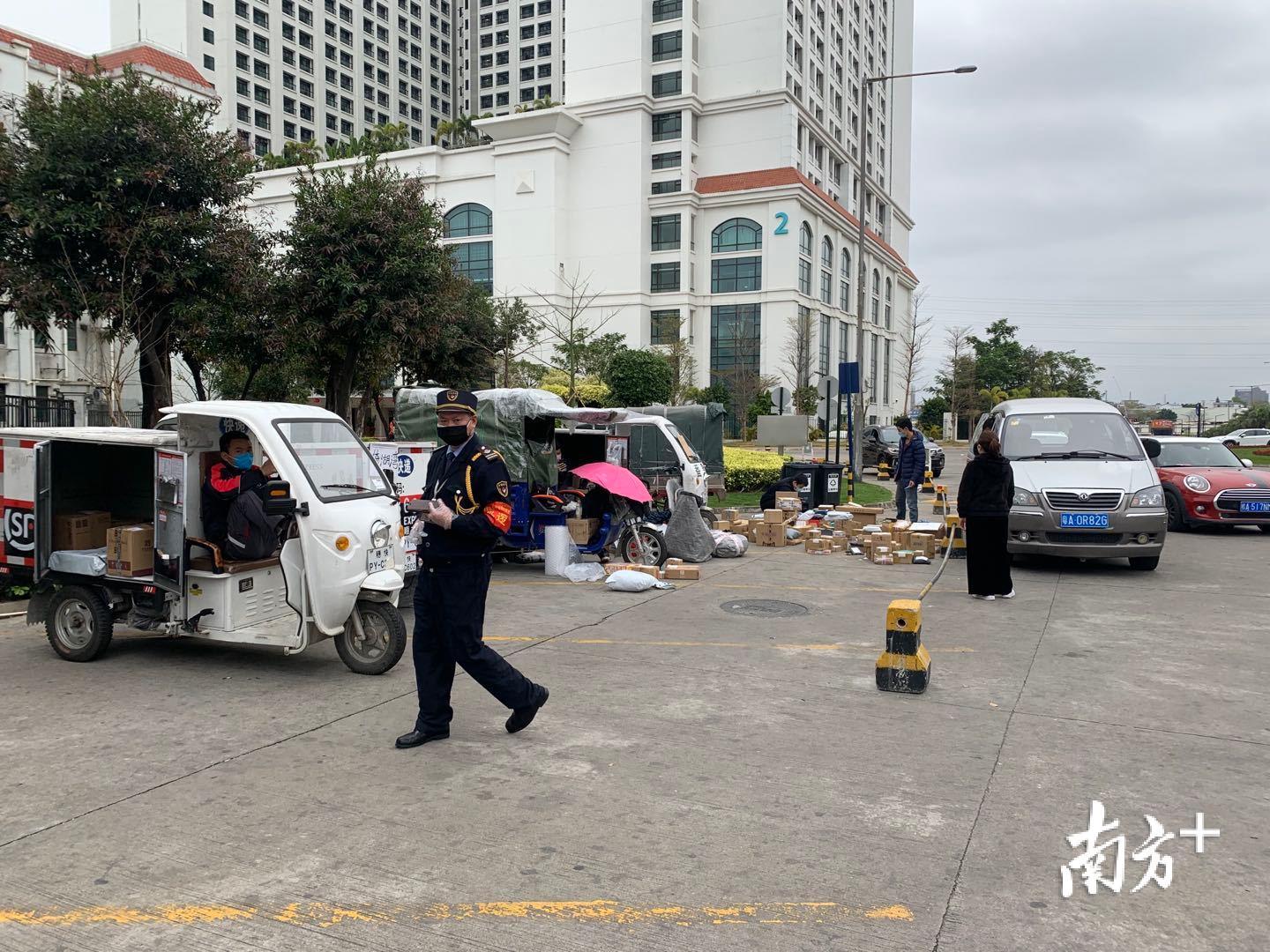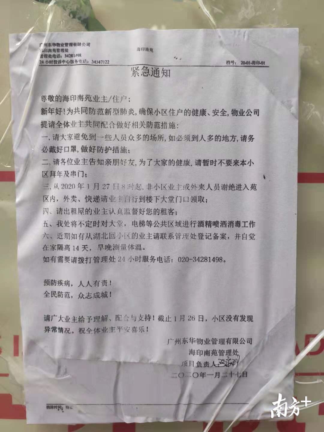 2月7日下午3点,记者走访海珠区素社街道的南苑社区,这里1月27日已经正式发出通知,实行了封闭式的管理。具体措施包括1.拒绝一切的亲友来访,即便业主亲自下来门口接上家里也不行;2.外卖、快递集中到大堂门口领取;3.出租屋的业主,必须认真监督好租客。