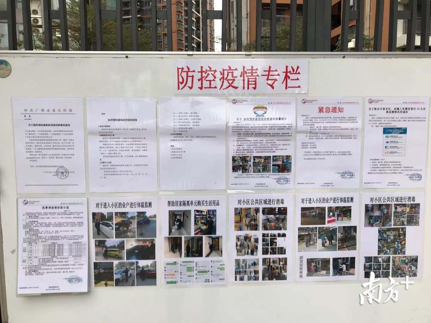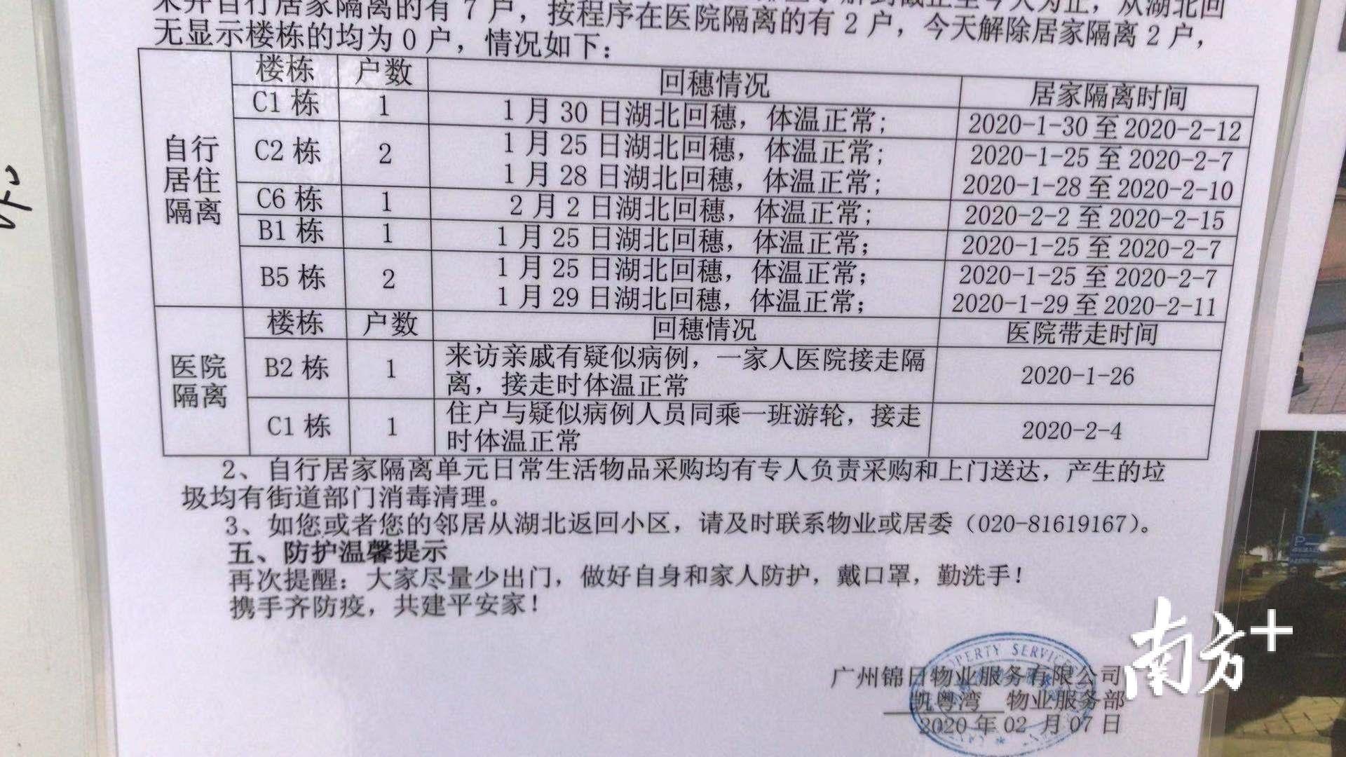 小区保安告诉记者,目前,该小区每天都会更新疫情防控日报,内容包括物业人员动态、小区消毒动态、服务窗口动态和小区排查动态。此前根据广州市卫健委的通报,该小区已有确诊病例,记者通过物业处了解到,该确诊病例是由外地返回广州的路途中确诊,确诊后并未进入小区。截至2月7日,该小区共有居家隔离7户,医院隔离两户。